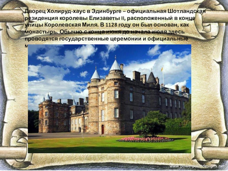 Слайд 15Дворец Холируд-хаус в Эдинбурге – официальная Шотландская резиденция королевы Елизаветы II, расположенный