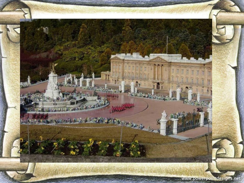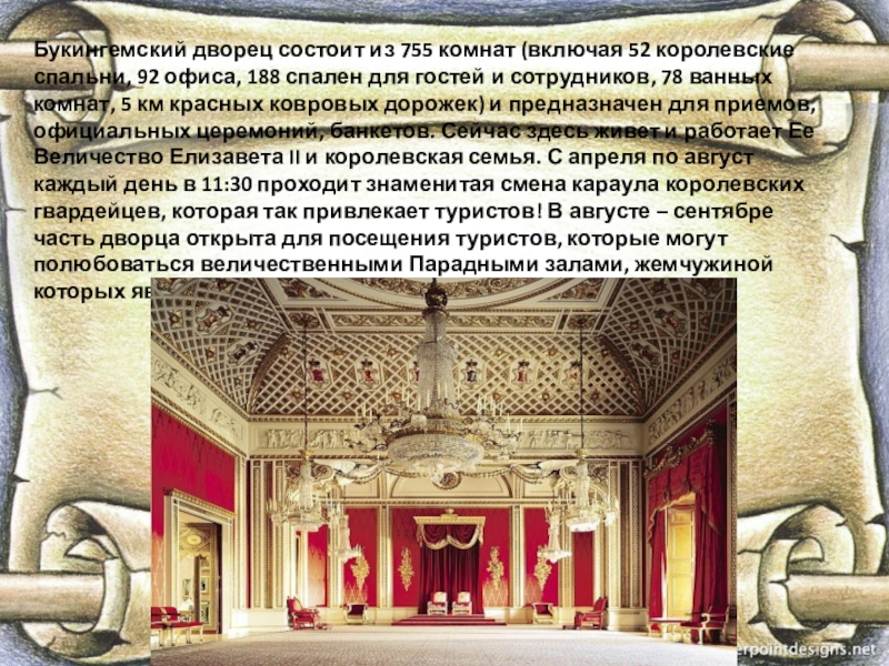 офиса, 188 спален для гостей и сотрудников, 78 ванных комнат, 5 км красных ковровых дорожек) и предназначен для приемов, официальных церемоний, банкетов. Сейчас здесь живет и работает Ее Величество Елизавета II и королевская семья. С апреля по август каждый день в 11:30 проходит знаменитая смена караула королевских гвардейцев, которая так привлекает туристов! В августе – сентябре часть дворца открыта для посещения туристов, которые могут полюбоваться величественными Парадными залами, жемчужиной которых является золотой Тронный зал.