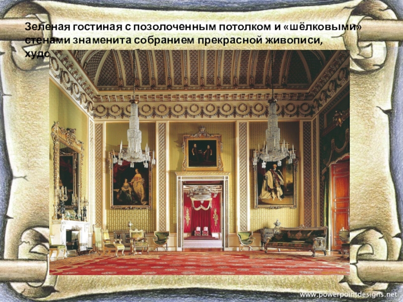 Слайд 9Зеленая гостиная с позолоченным потолком и «шёлковыми» стенами знаменита собранием прекрасной живописи,