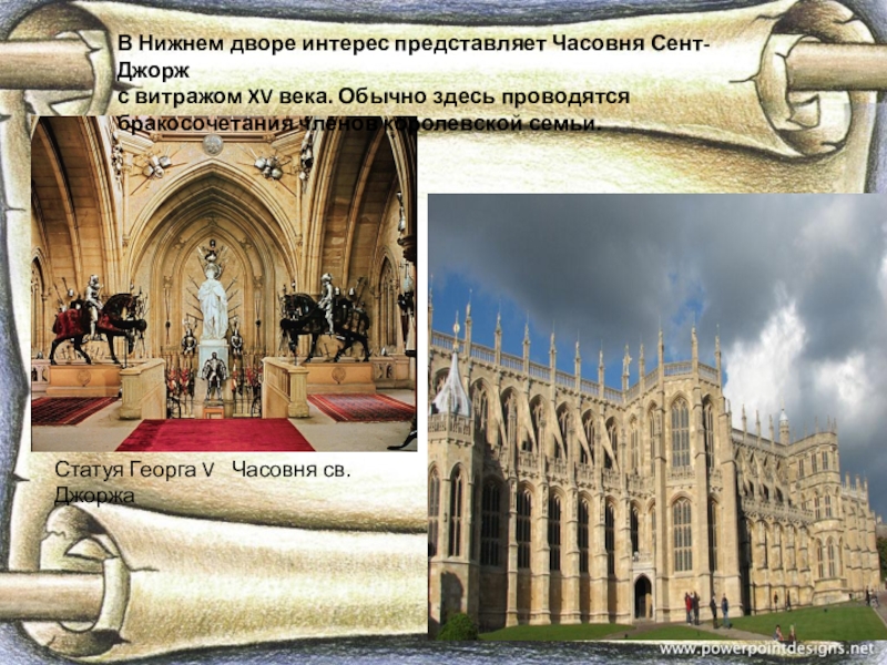 Статуя Георга V	Часовня св. Джоржа В Нижнем дворе интерес представляет Часовня Сент-Джорж с витражом XV века. Обычно здесь проводятся бракосочетания