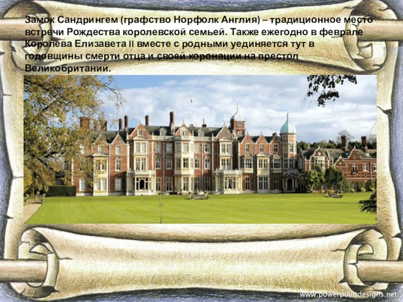 Слайд 14Замок Сандрингем (графство Норфолк Англия) – традиционное место встречи Рождества королевской семьей.