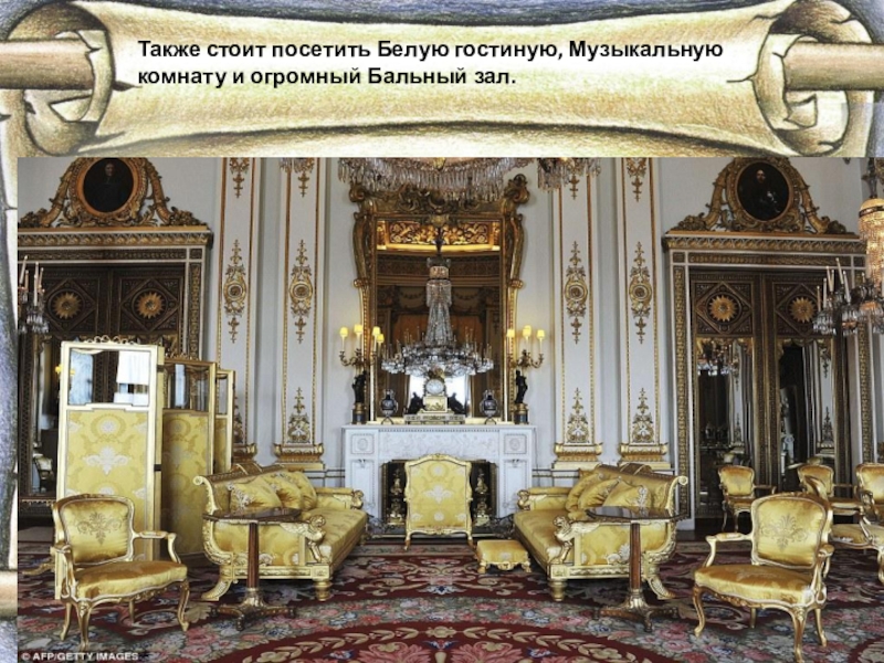 Слайд 6Также стоит посетить Белую гостиную, Музыкальную комнату и огромный Бальный зал.