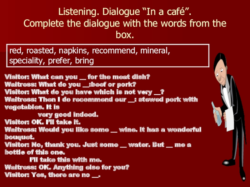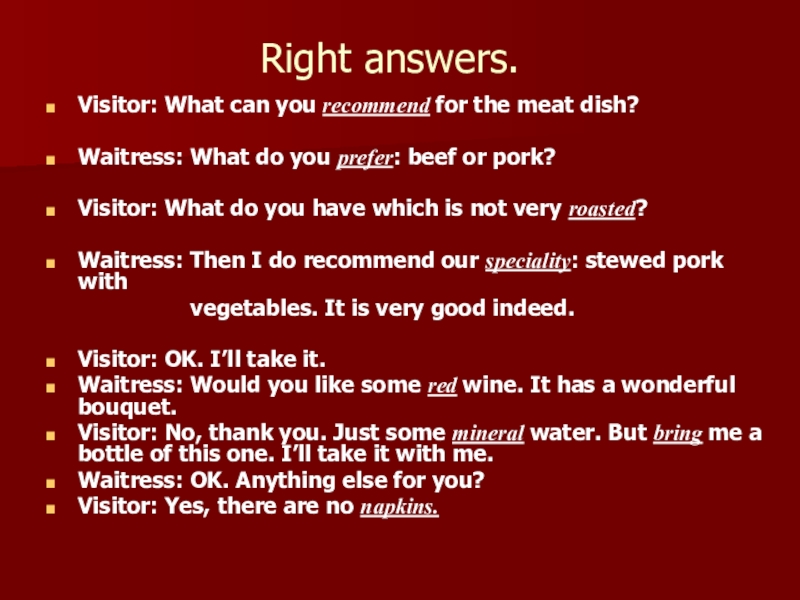 Visitor: No, thank you. Just some mineral water. But bring me a bottle of this one. I’ll take it with me.