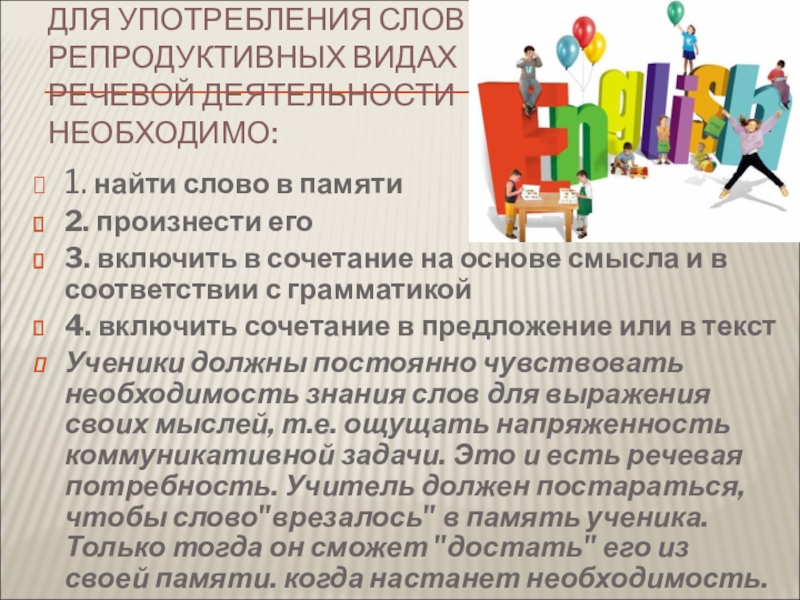 Владение словом является важнейшей предпосылкой говорения. В репродуктивной речевой деятельности недостаточно знания только одного слова. важно, чтобы дети владели связями слова и образованием на их основе словосочетания.