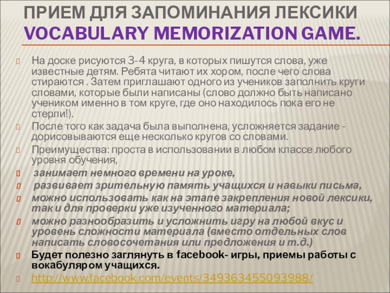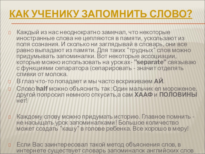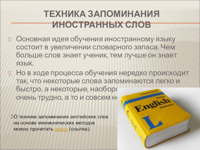 О технике запоминания английских слов на основе мнемонических методов можно прочитать здесь (ссылка).