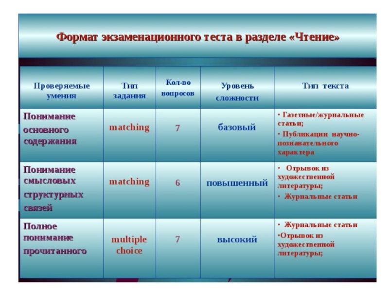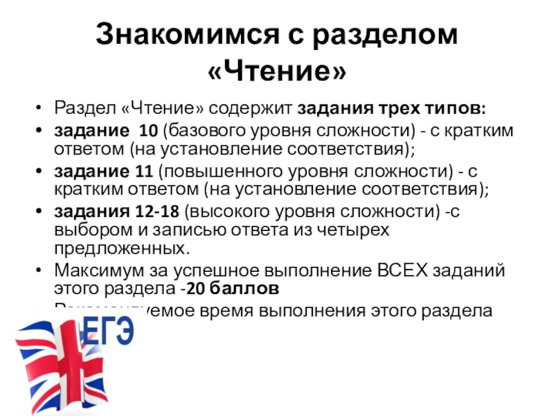 Раздел «Чтение» содержит задания трех типов: