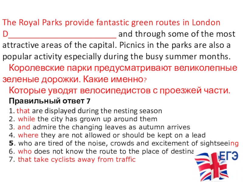 Слайд 13The Royal Parks provide fantastic green routes in London D_______________________ and