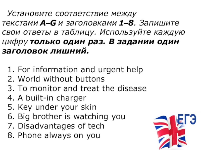 Слайд 6Установите соответствие между текстами A–G и заголовками 1–8. Запишите свои ответы в таблицу. Используйте