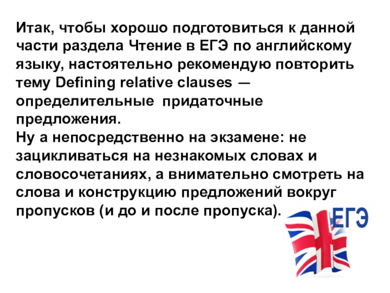 Слайд 14Итак, чтобы хорошо подготовиться к данной части раздела Чтение в ЕГЭ