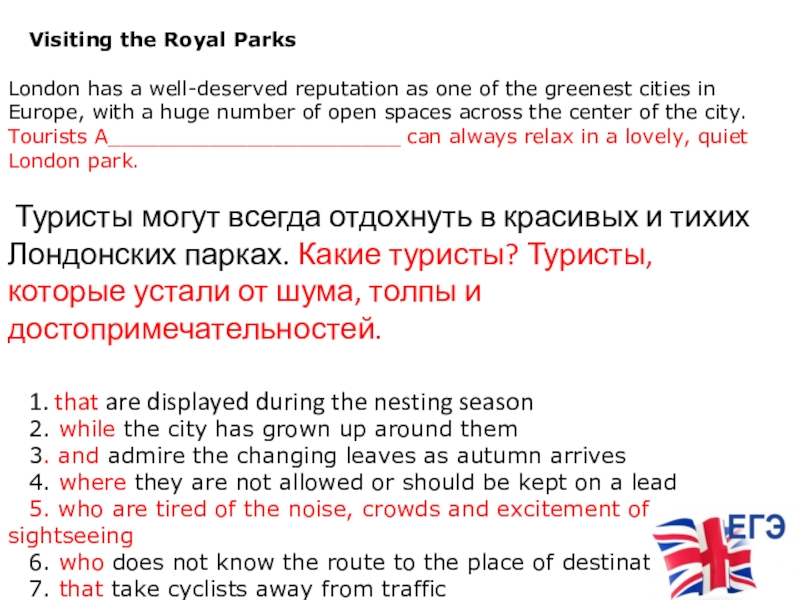 of the greenest cities in Europe, with a huge number of open spaces across the center of the city. Tourists A_______________________ can always relax in a lovely, quiet London park.