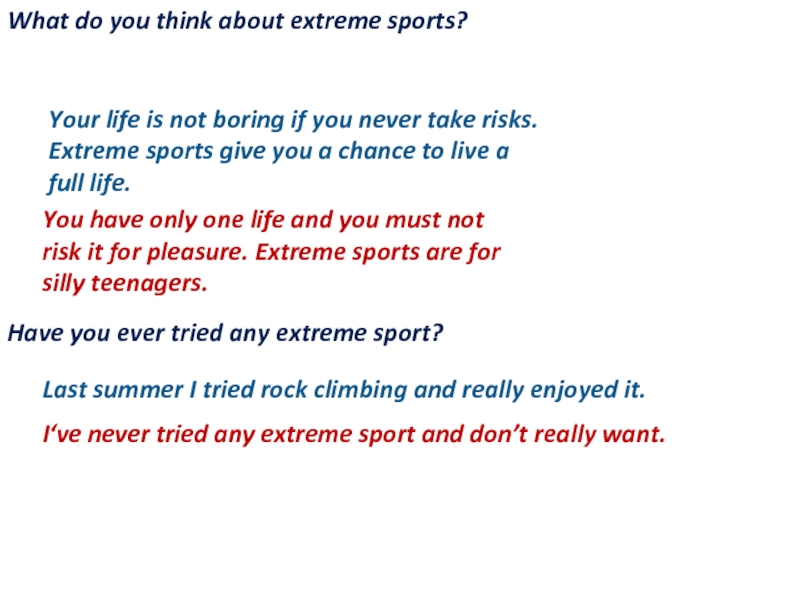 You have only one life and you must not risk it for pleasure. Extreme sports are for silly teenagers.