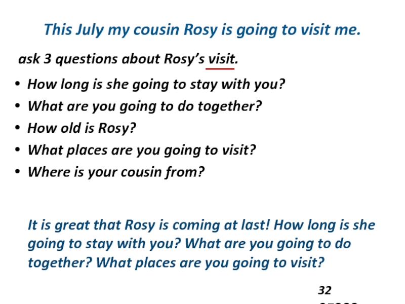 It is great that Rosy is coming at last! How long is she going to stay with you? What are you going to do together? What places are you going to visit?