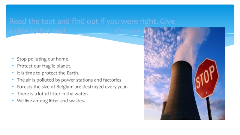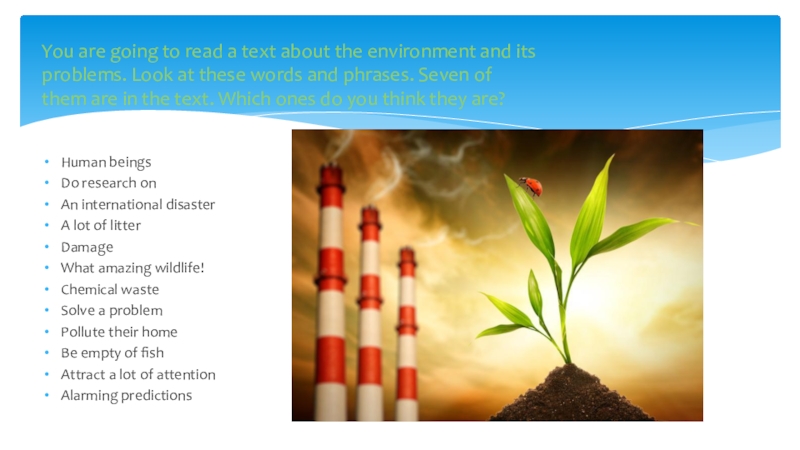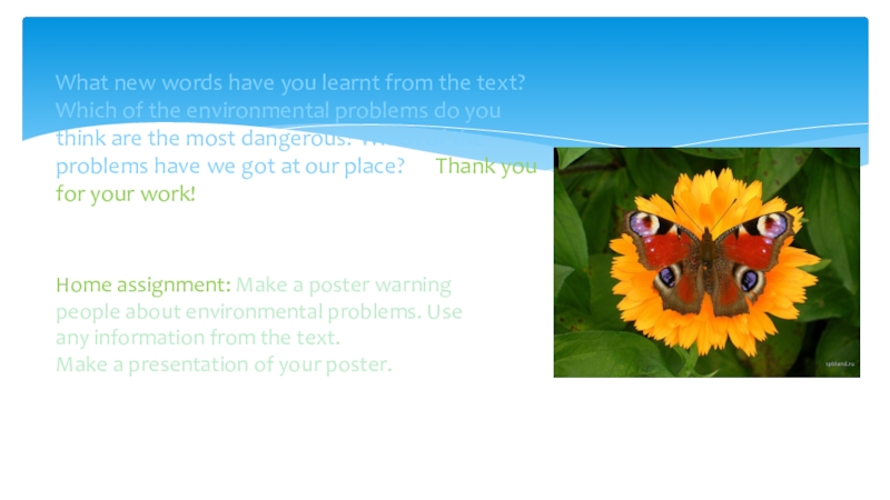 Home assignment: Make a poster warning people about environmental problems. Use any information from the text. Make a presentation of your poster.