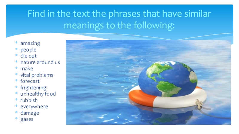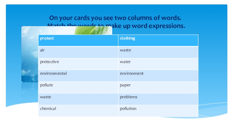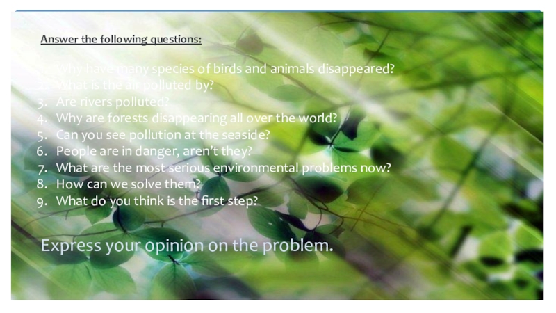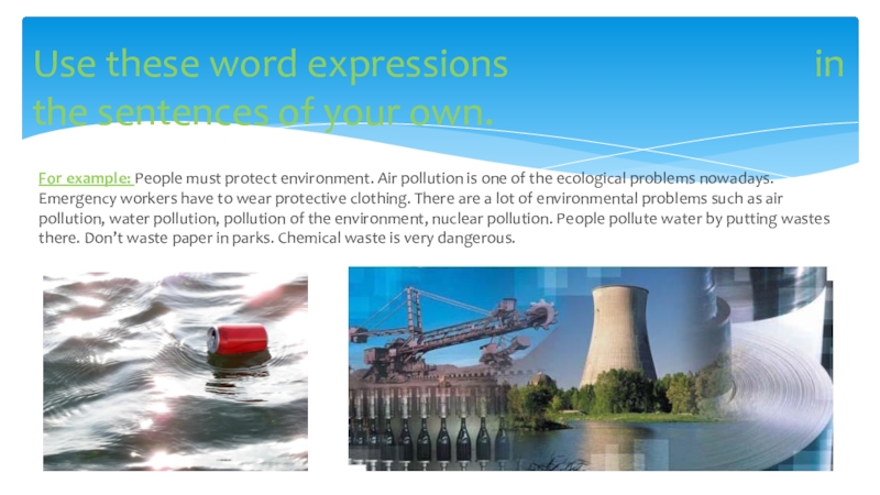 For example: People must protect environment. Air pollution is one of the ecological problems nowadays. Emergency workers have to wear protective clothing. There are a lot of environmental problems such as air pollution, water pollution, pollution of the environment, nuclear pollution. People pollute water by putting wastes there. Don’t waste paper in parks. Chemical waste is very dangerous.