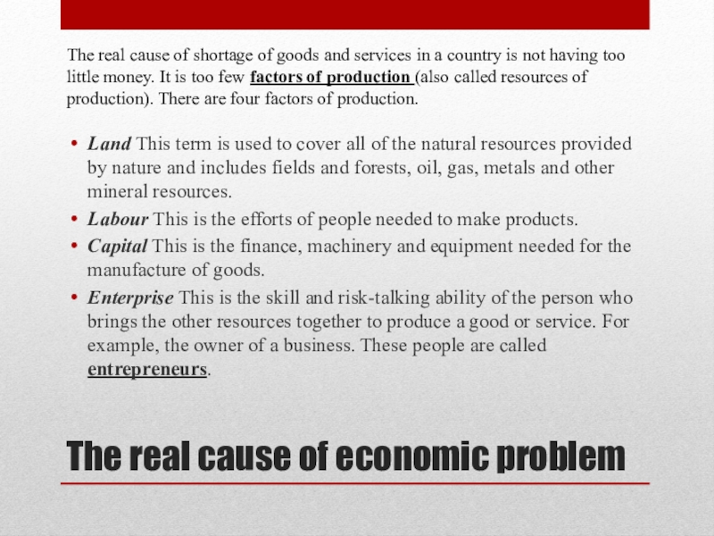 The real cause of shortage of goods and services in a country is not having too little money. It is too few factors of production (also called resources of production). There are four factors of production.