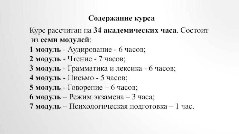 Содержание курсаКурс рассчитан на 34 академических часа. Состоит из семи модулей:1 модуль - Аудирование - 6 часов;2