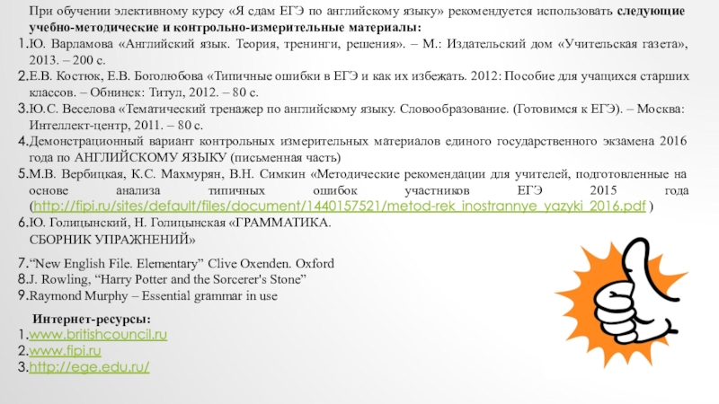 При обучении элективному курсу «Я сдам ЕГЭ по английскому языку» рекомендуется использовать следующие учебно-методические и контрольно-измерительные материалы: