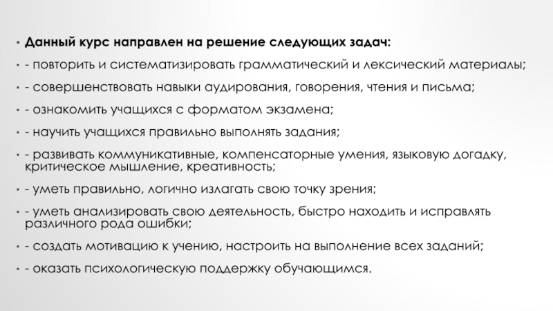 Данный курс направлен на решение следующих задач:- повторить и систематизировать грамматический и лексический материалы;- совершенствовать навыки аудирования,