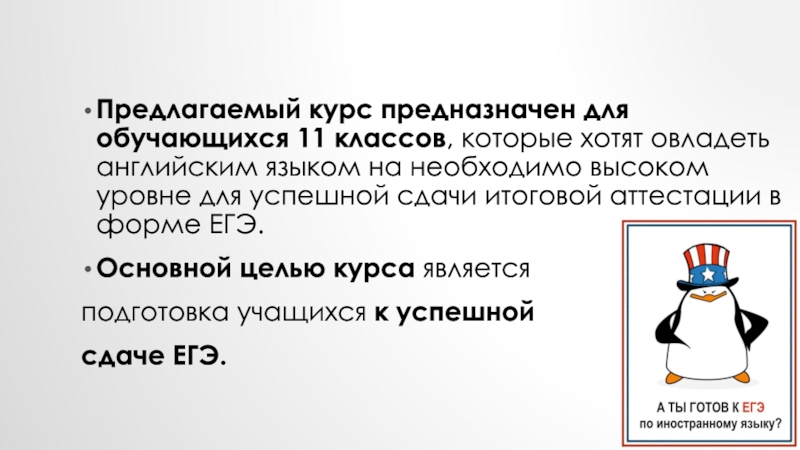 Слайд 2Предлагаемый курс предназначен для обучающихся 11 классов, которые хотят овладеть английским
