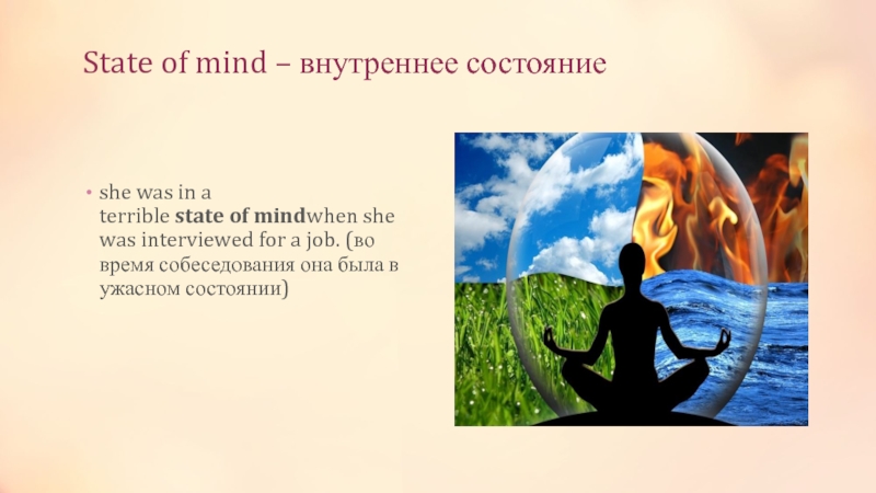 State of mind – внутреннее состояние she was in a terrible state of mindwhen she was interviewed for a job. (во
