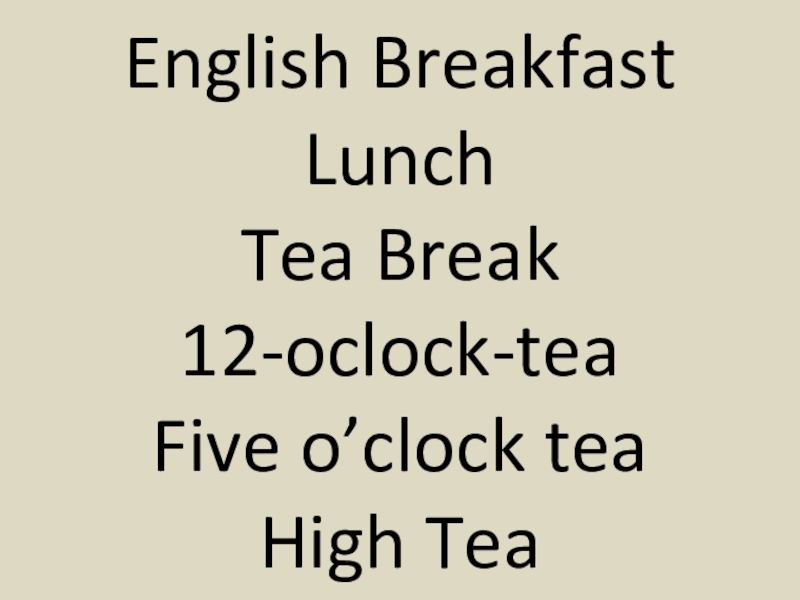 Слайд 5English Breakfast Lunch Tea Break 12-oclock-tea Five o’clock tea High Tea