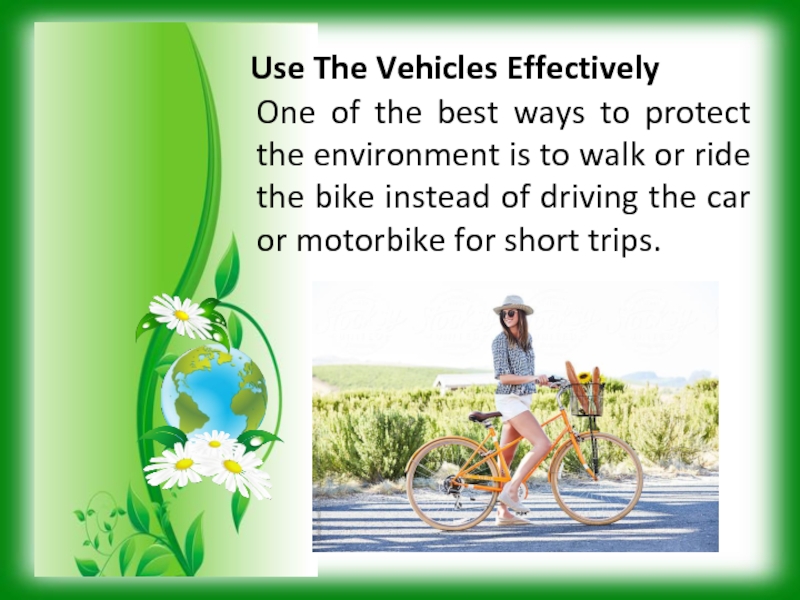 Use The Vehicles Effectively One of the best ways to protect the environment is to walk or