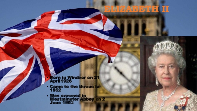 ELIZABETH IIBorn in Windsor on 21 April1926Came to the throne in 1952Was crowned in Westminster Abbey on