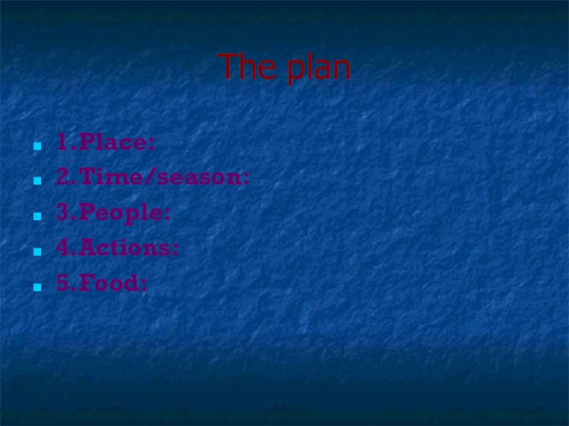 The plan1.Place:2.Time/season:3.People:4.Actions:5.Food: