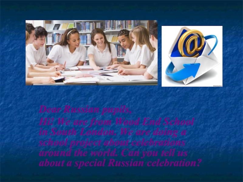Dear Russian pupils,Hi! We are from Wood End School in South London. We are doing a school