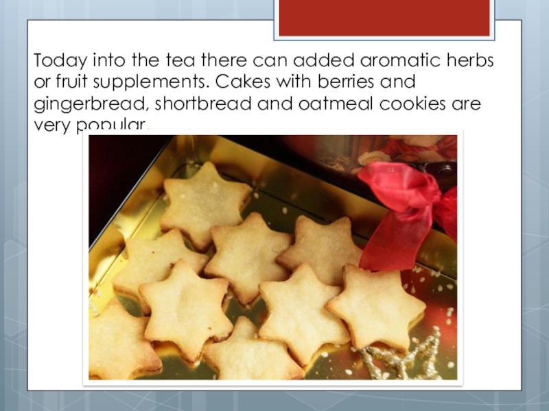 supplements. Cakes with berries and gingerbread, shortbread and oatmeal cookies are very popular.