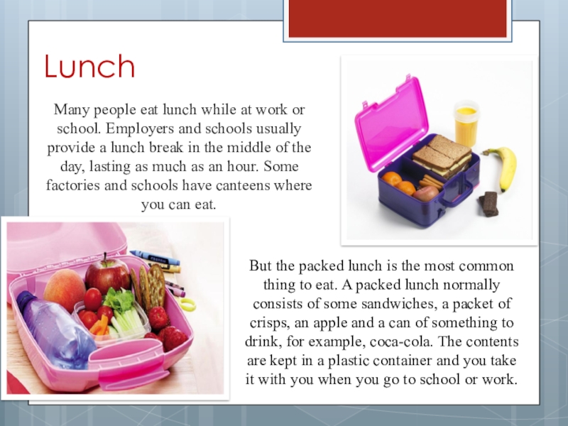 But the packed lunch is the most common thing to eat. A packed lunch normally consists of some sandwiches, a packet of crisps, an apple and a can of something to drink, for example, coca-cola. The contents are kept in a plastic container and you take it with you when you go to school or work.
