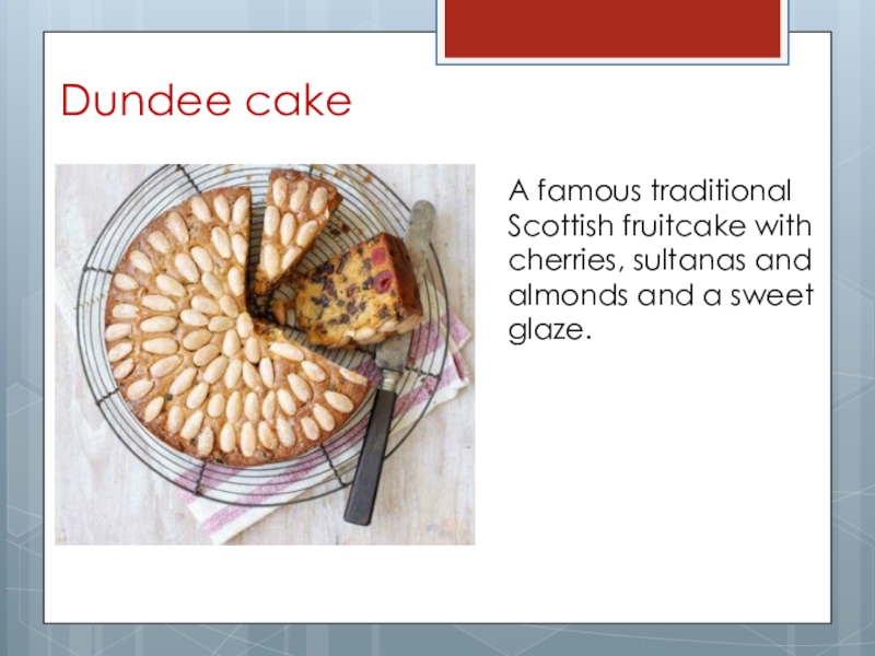A famous traditional Scottish fruitcake with cherries, sultanas and almonds