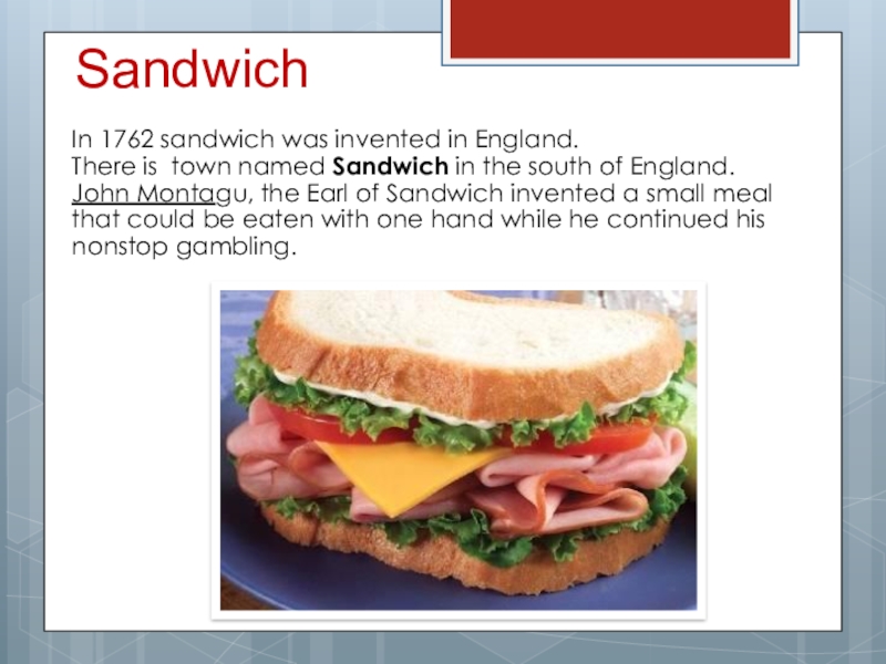 in the south of England. John Montagu, the Earl of Sandwich invented a small meal that could be eaten with one hand while he continued his nonstop gambling.