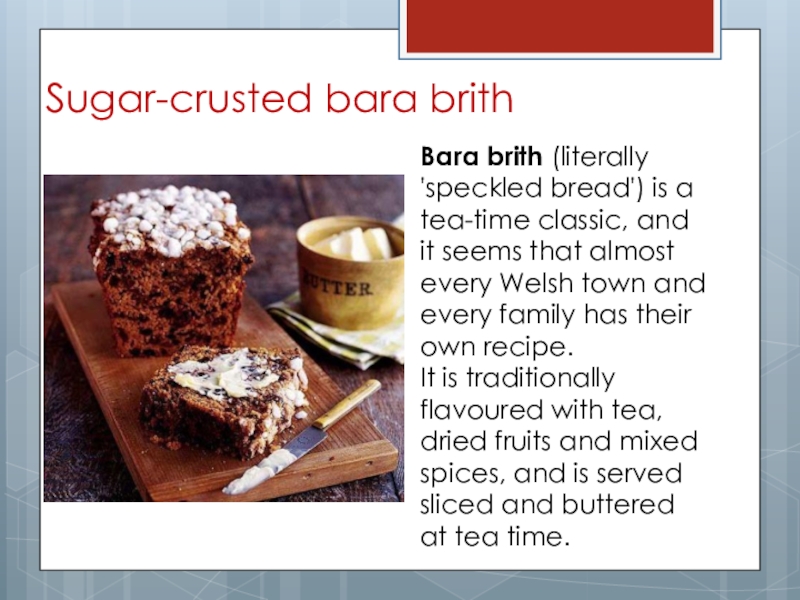 Bara brith (literally 'speckled bread') is a tea-time classic,