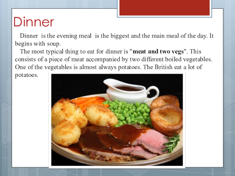 The most typical thing to eat for dinner is "meat and two vegs". This consists of a piece of meat accompanied by two different boiled vegetables. One of the vegetables is almost always potatoes. The British eat a lot of potatoes.