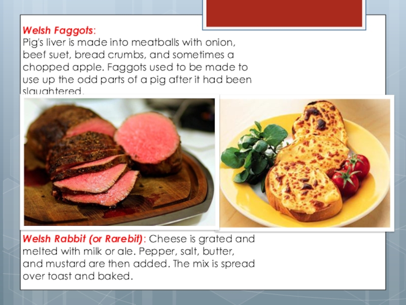 Welsh Rabbit (or Rarebit): Cheese is grated and melted with milk or ale. Pepper, salt, butter, and mustard are then added. The mix is spread over toast and baked.