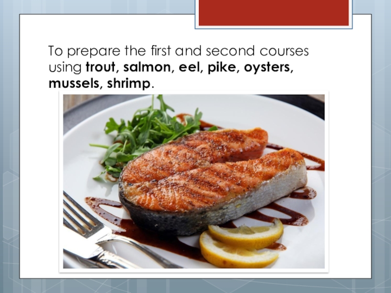 Слайд 34To prepare the first and second courses using trout, salmon, eel,