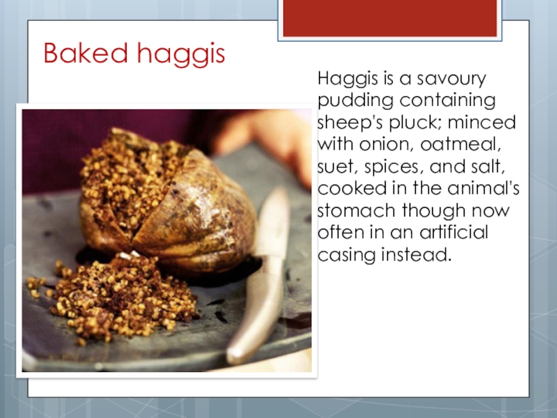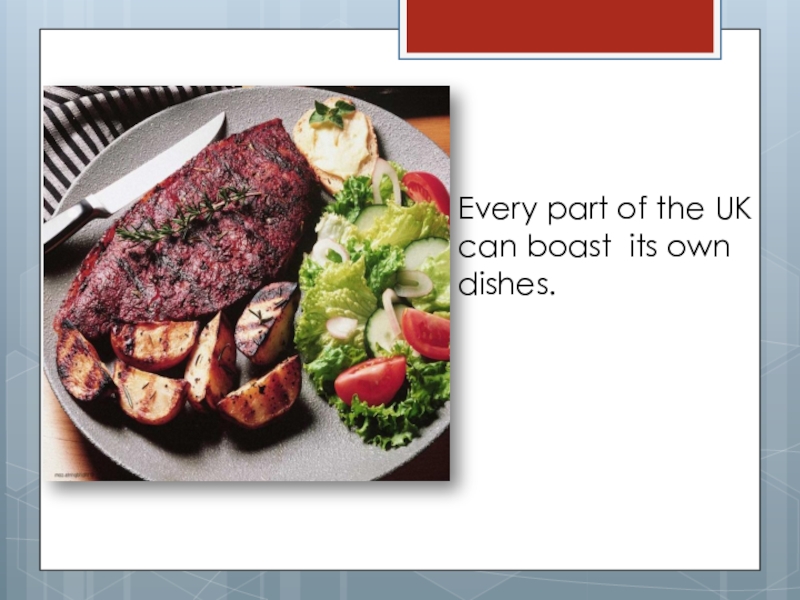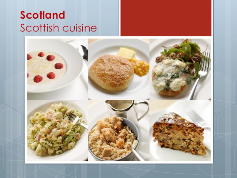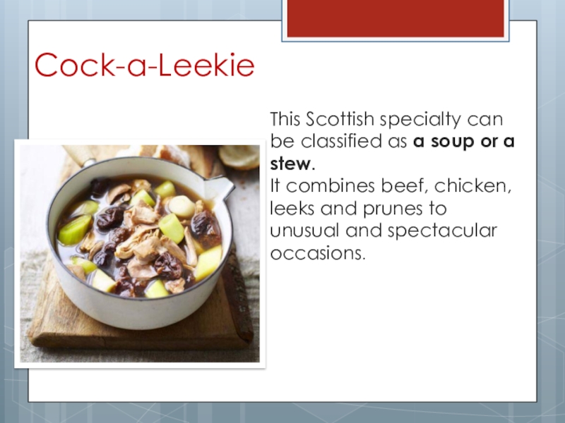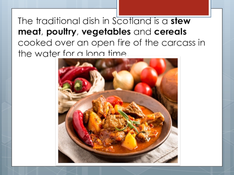 Слайд 16The traditional dish in Scotland is a stew meat, poultry, vegetables