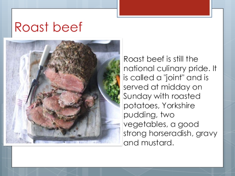 called a "joint" and is served at midday on Sunday with roasted potatoes, Yorkshire pudding, two vegetables, a good strong horseradish, gravy and mustard.
