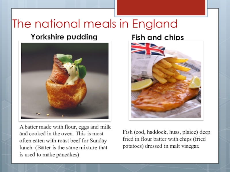 eggs and milk and cooked in the oven. This is most often eaten with roast beef for Sunday lunch. (Batter is the same mixture that is used to make pancakes)