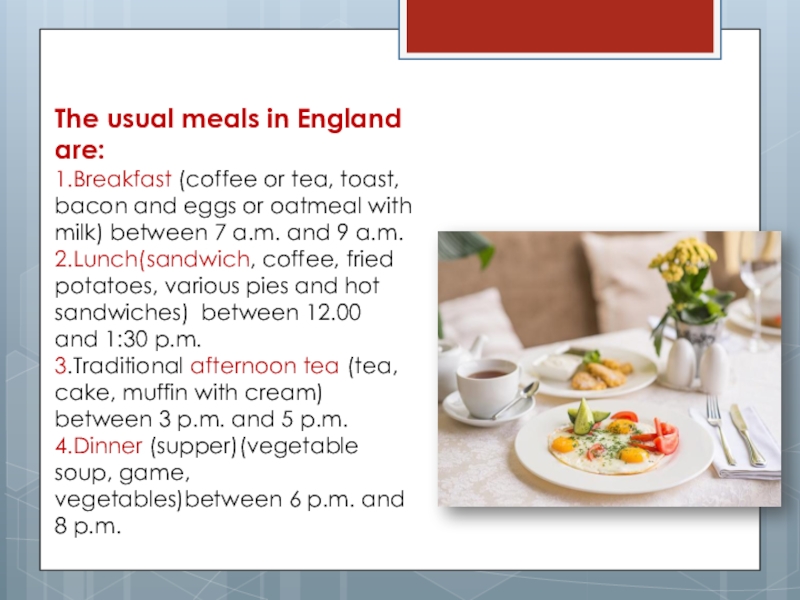 4.Dinner (supper)(vegetable soup, game, vegetables)between 6 p.m. and 8 p.m.