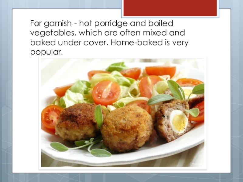 Слайд 17For garnish - hot porridge and boiled vegetables, which are often