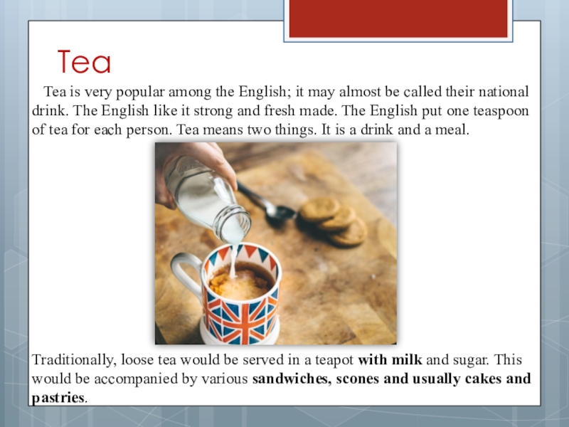 called their national drink. The English like it strong and fresh made. The English put one teaspoon of tea for each person. Tea means two things. It is a drink and a meal.