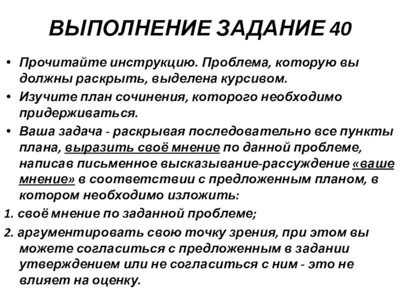Ваша задача - раскрывая последовательно все пункты плана, выразить своё мнение по данной проблеме, написав письменное высказывание-рассуждение «ваше мнение» в соответствии с предложенным планом, в котором необходимо изложить: