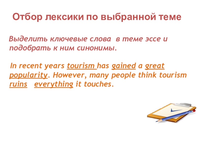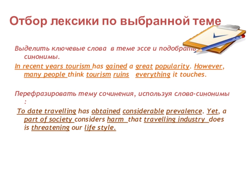 Выделить ключевые слова в теме эссе и подобрать к ним синонимы.