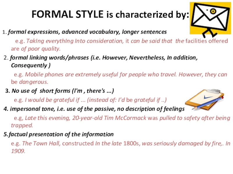 4. impersonal tone, i.e. use of the passive, no description of feelings