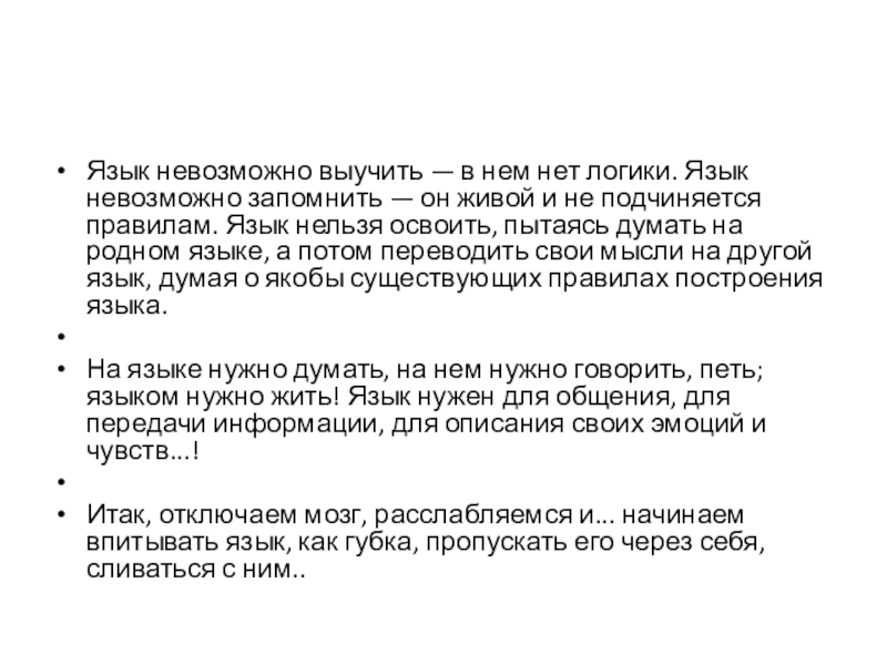 Слайд 2Язык невозможно выучить — в нем нет логики. Язык невозможно запомнить