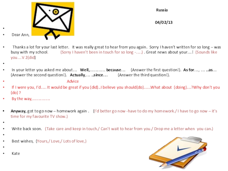 Thanks a lot for your last letter. It was really great to hear from you again. Sorry I haven’t written for so long – was busy with my school. (Sorry I haven’t been in touch for so long -….) . Great news about your…! (Sounds like you…V 2(did)
