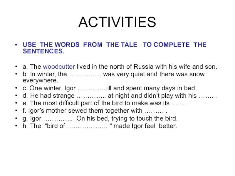 ACTIVITIESUSE THE WORDS FROM THE TALE  TO COMPLETE THE SENTENCES.a. The woodcutter lived in the north
