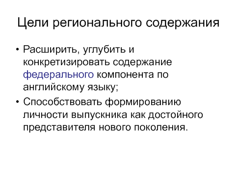 Цели регионального содержанияРасширить, углубить и конкретизировать содержание федерального компонента по английскому языку;Способствовать формированию личности выпускника как достойного